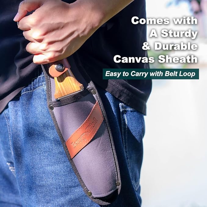 - Sturdy & Durable Canvas Sheath: Comes with a sturdy & durable canvas sheath to protect your knife when not in use. The leather sheath includes a belt loop so you can attach the sheath and knife to your belt, which makes carrying the knife in the garden safer and easier.