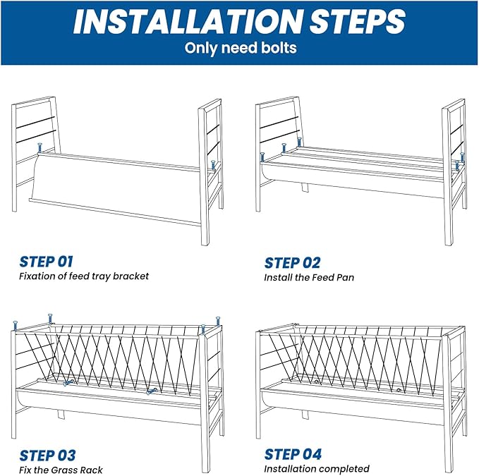 - 𝐏𝐫𝐞𝐦𝐢𝐮𝐦 𝐐𝐮𝐚𝐥𝐢𝐭𝐲 𝐌𝐚𝐭𝐞𝐫𝐢𝐚𝐥: The grass feeder is made of durable stainless steel frame, galvanized feed tray and features solid solder joints, ensuring long-lasting use. The goat hay feeder has a smooth surface and U-shaped design, making it easy to clean and maintain in any stall.
