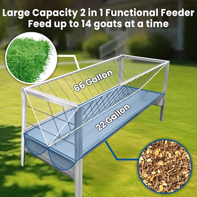 - 𝐋𝐚𝐫𝐠𝐞 𝐂𝐚𝐩𝐚𝐜𝐢𝐭𝐲: Our hay feeder measures 65'' x 30'' x 35'' and holds 66 gallons of hay and 22 gallons of grain. The goat feeder can feed up to 16 goats at a time, making it suitable for larger farms.