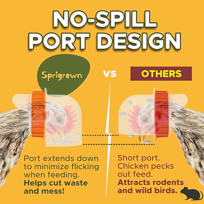 - No-spill feeding ports: No waste chicken feeder with deep ports keep feed inside. Reliable gravity chicken feeder that cuts mess and save money