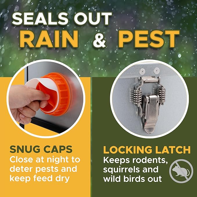 - Weather & pest blocking: Latched top and ports with caps create a waterproof chicken feeder and help deter rodents - use as a rat proof chicken feeder or an automatic chicken feeder rat proof setup for your chicken coop feeder system.