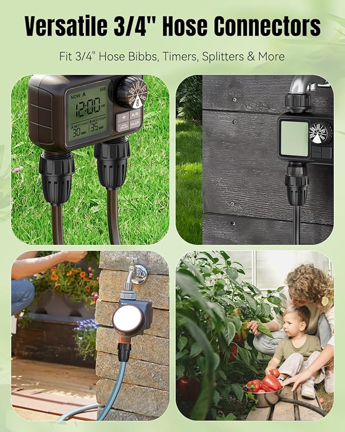 - Versatile Connectors: Fully compatible with 3/4" garden faucets, hose bibbs, hoses, splitters, timers, filters, sprinklers, vacuum breakers, and other irrigation components. Effortlessly customize your system for optimal water delivery