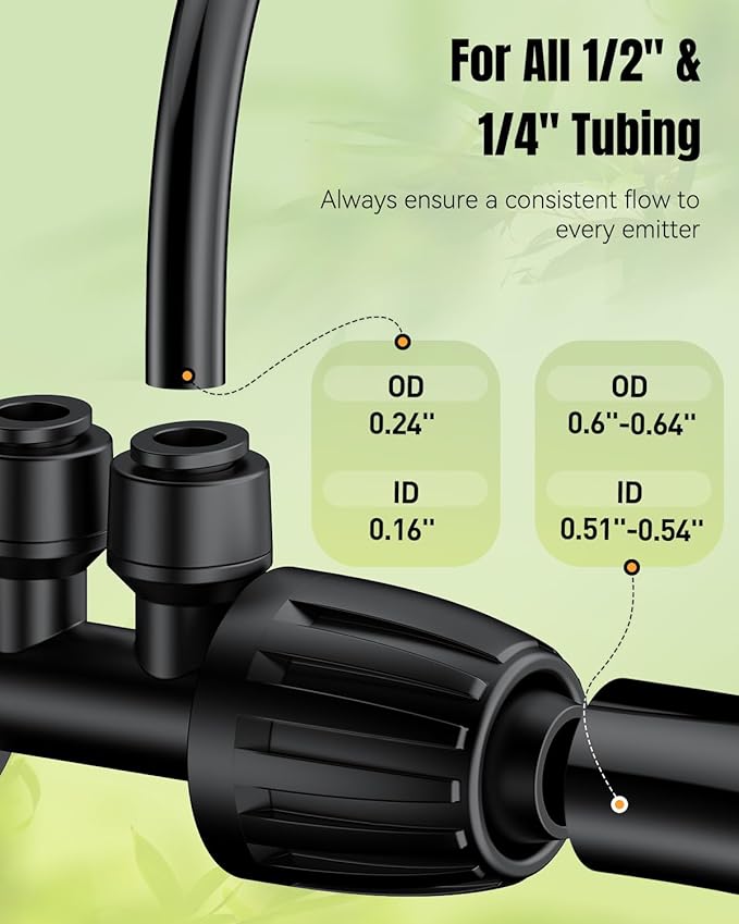 - Optimized Water Distribution: Enjoy balanced pressure throughout your irrigation system! Secure locking mechanism in the 1/2'' to 1/4'' drip irrigation fitting effectively prevents leaks or budging. Always ensure a consistent flow to every emitter