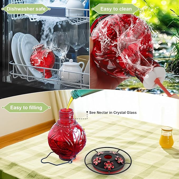 - Easy to Refill and Clean: The design of this hummingbird feeder includes an extra-wide mouth bottle that facilitates effortless filling of nectar and cleaning. The components can be easily disassembled, while the heat-toughened glass ensures dishwasher safety. Transparent walls provide clear visibility of nectar levels at a glance, enabling timely refills and ensuring a clean water source for hummingbirds—making your bird-keeping experience more convenient!