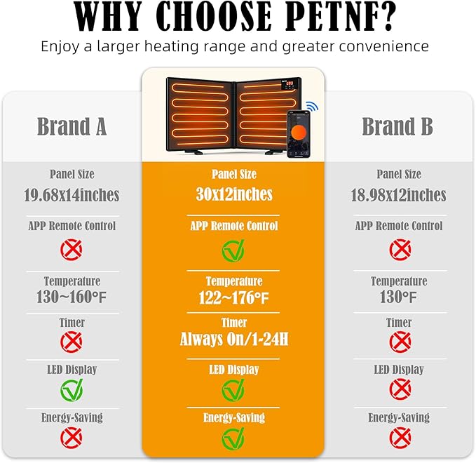 - Energy-Efficient Design: The PETNF chicken coop heater for winter offers a large heating area with low power consumption. Measuring 30 x 12 inches and using only 180 watts, it provides effective warmth while helping to keep your electricity bills low. This efficient design ensures you get reliable heat without unnecessary energy use