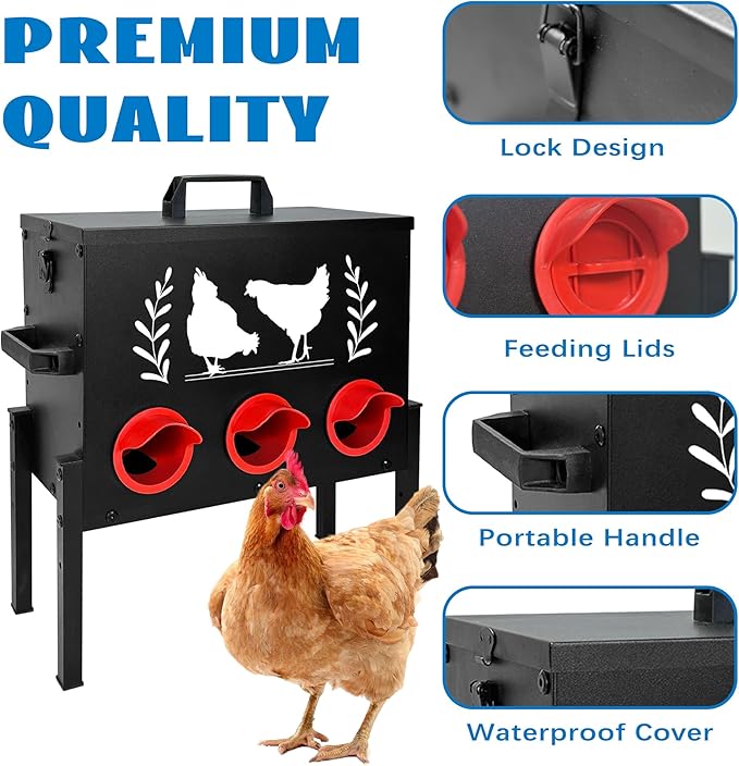- 【Premium Rustproof Metal Built to Last】Engineered with high-quality rustproof metal, this feeder is designed to withstand the toughest outdoor conditions. Its durable construction is not only resistant to rust and corrosion but also protects against daily wear and tear. The rainproof cover ensures your feed stays dry and fresh, even in bad weather, keeping your flock happy and healthy while reducing waste. Built to last, this feeder is the ultimate long-term investment for your poultry needs.