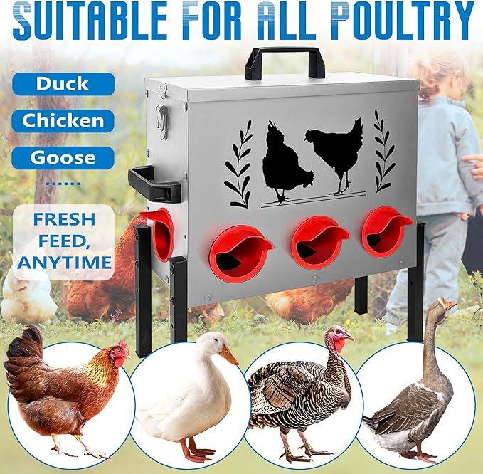 - 【Premium Rustproof Metal Built to Last】Engineered with high-quality rustproof metal, this feeder is designed to withstand the toughest outdoor conditions. Its durable construction is not only resistant to rust and corrosion but also protects against daily wear and tear. The rainproof cover ensures your feed stays dry and fresh, even in bad weather, keeping your flock happy and healthy while reducing waste. Built to last, this feeder is the ultimate long-term investment for your poultry needs