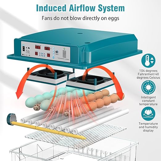 - INCREASE EFFICIENCY: The incubator has 2 fan-driven heaters, the hot air will not blow directly to the eggs, it can reach the set temperature quickly and maintain it automatically.