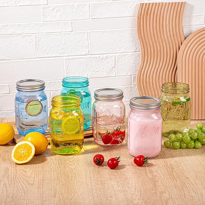 WELLIFE 6PCS 32 oz Mason Jars Wide Mouth-Vibrant Colored Glass Jars for Canning, Food Storage, Fermenting & DIY Craft. Glass Jar with Lid, Airtight & Durable