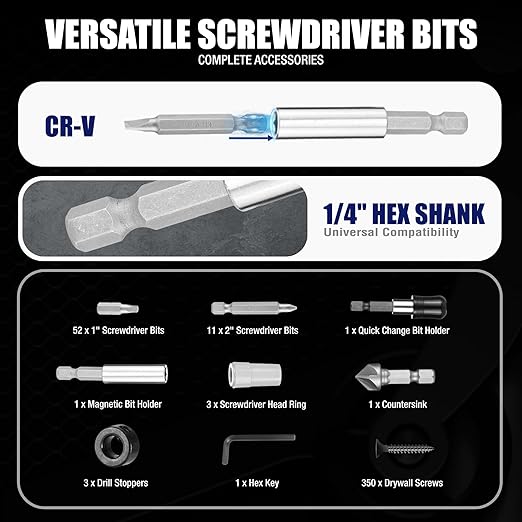 - All-in-One 455-Piece Drill Driver Bit Set: Complete 26-piece drill bit set for metal, wood, plastic, concrete, and masonry drilling, plus 63 screwdriver bits, 6 nut drivers, 3 drill stoppers, quick change bit holder, magnetic bit holder, 3 screwdriver head rings, countersink, hex key and 350 drywall screws. Perfect for home repair, DIY projects, and professional use.