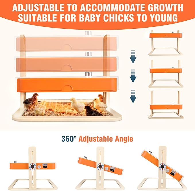 - ALL-STAGE ADAPTABLE CHICKEN COOP HEATER FOR WINTER - From newborn chicks to fully-grown hens, this chicken heat plate adapts to every stage. Lay it flat for chicks and adjust the height and angle as they grow, ensuring warmth at every development phase. Save money and space with one device that meets every need!