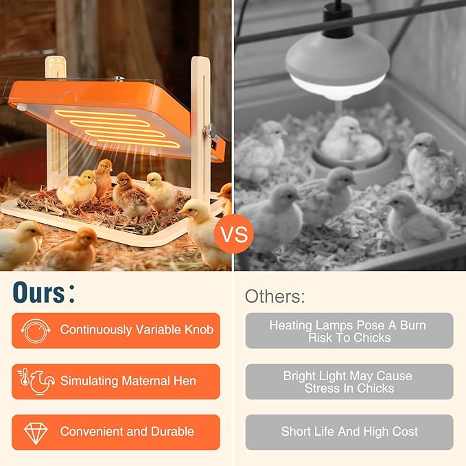 - THOUGHTFUL DESIGN FOR CHICKEN COOP ACCESSORIES - Additionally, its non-glowing, low-disturbance design fosters a serene resting space for chicks—mimicking the calm of their natural habitat to curb stress and promote healthy growth. We’ve solved the top frustration with traditional chick warmers (constant mess from chicks jumping, perching, and soiling the heat plate) by adding a removable top panel—wipe clean or rinse off for effortless maintenance in seconds. Unlike risky brooder lamps, this chick brooder heating plate is a safer, fire-free alternative that safeguards your flock, brooder setup, and peace of mind.