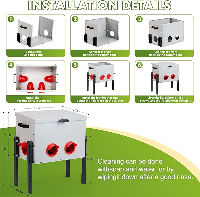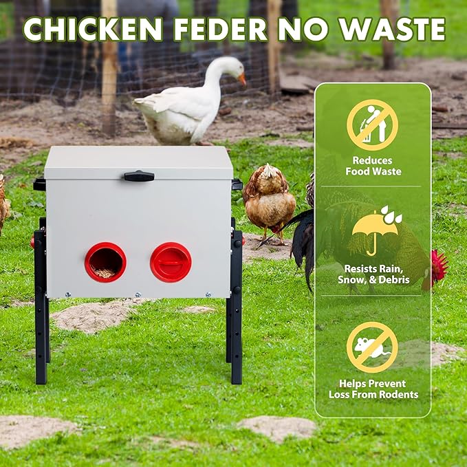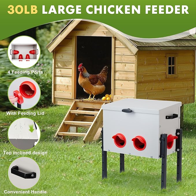 - Ultra Capacity Design: Specially designed for efficient chicken farming, metal feed box can easily hold 30 pounds of feed, reducing the hassle of frequent feeding.