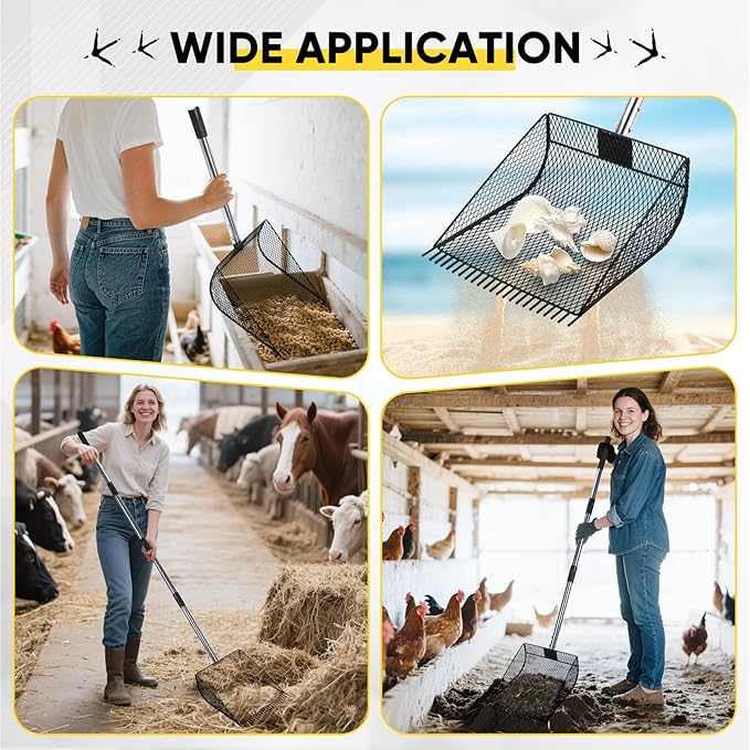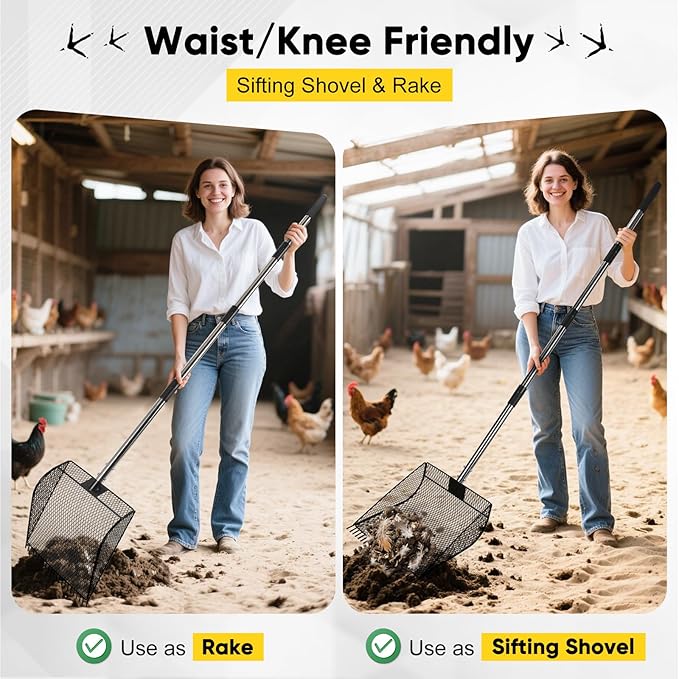- 【Efficiently Multi-funtion Sifter Shovel】 Enlarged design doubles cleaning efficiency. This chicken poop scoop can be used for large-scale cleaning work in chicken coops, and can be used as a rake to clean chicken feathers or litter in the chicken coop, also can be adjusted to the right length to be used as a cat litter scooper, beach search sand scoop and cow pens shovel, etc