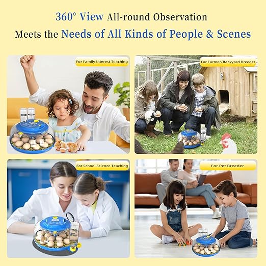 - 【360° Viewing Egg Hatching Incubator with Egg Candler】The egg candler helps you to visually observe the embryo development. Observe the egg development without having to purchase additional egg candler, saving your money. 360° transparent material allows you observation of the hatching process, makes it so fun for the family to get together to actively participate in the experience of incubating new life with your family and friends.