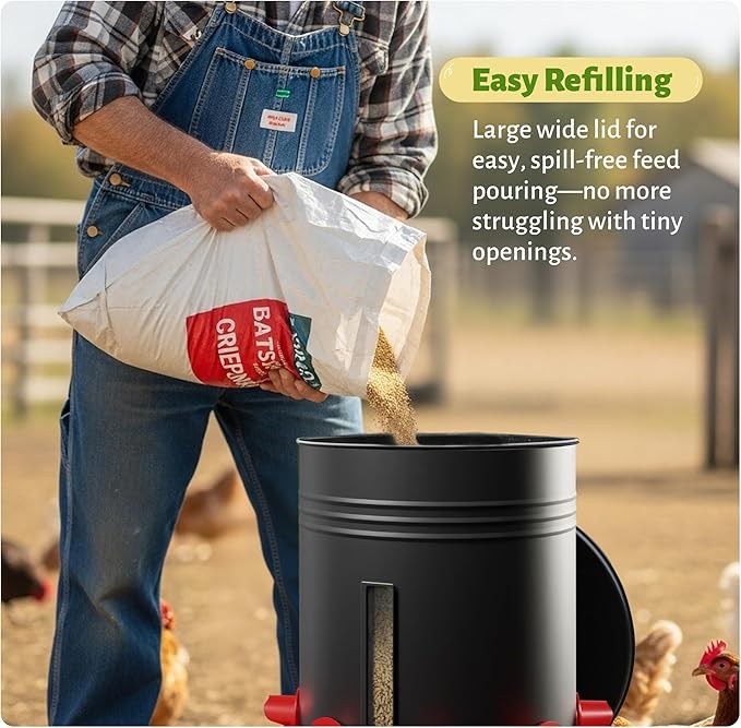 - Rust-Proof Metal Construction: Built with powder-coated steel construction, this chicken feeder resists rust and corrosion for lasting outdoor durability. The sturdy metal build withstands daily coop activity without damage.