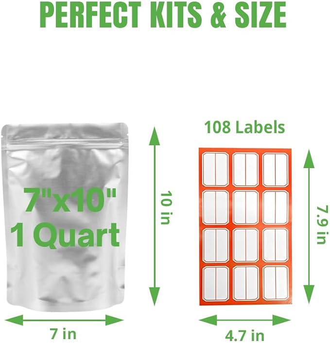 7x10 Inch Aluminum Zipper Mylar Bags, Food Storage Bag with Oxygen Absorbers 300cc and Labels, Smell Proof Pouch, Thick 10 Mil Stand up Pouches, Long Term Food Container Sets 50 Pack