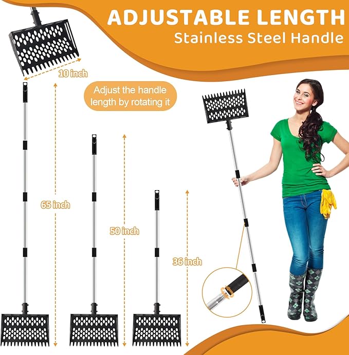 Chicken Poop Scooper & Rake, 2-in-1 Heavy Duty Metal Chicken Coop Scoop with Adjustable Length (36"–65"), Poultry Litter Tools Scooper Sand Sifting Shovel for Chicken Coops Animal Farms & Poultry Run