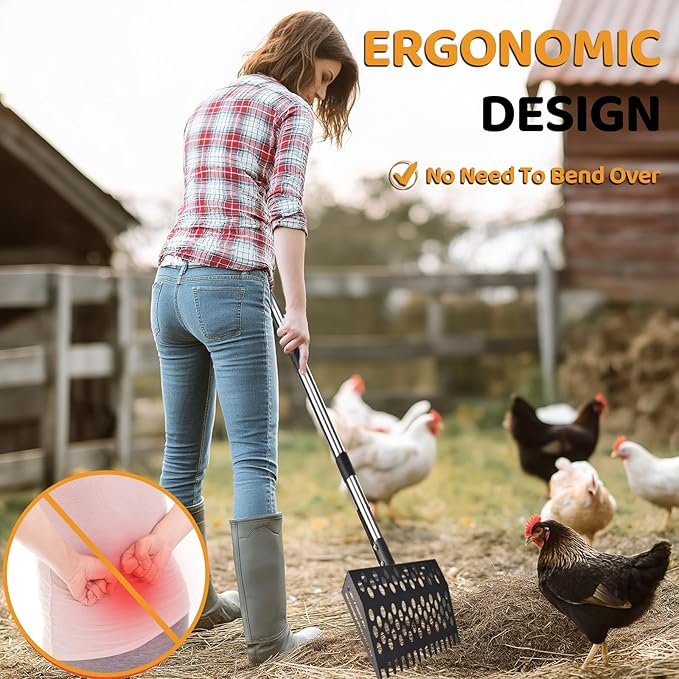 - Multi-Purpose & Easy to Clean: This sand sifting shovel is an essential tool for cleaning chicken coops and is also suitable for gardens, stables, dog kennels, sandpits, and litter boxes. Its rust-resistant surface can be easily cleaned with water.
