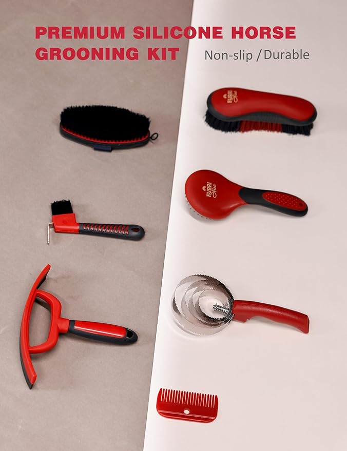 - Complete 9-Piece Grooming Set: This horse grooming kit includes all essential tools (Dandy Brush, Sweat Scraper, Hoof Pick w/ Brush, Body Brush, Round-Head Comb, Metal Curry Comb, Printed Waterproof Bag with Pocket, Sponge, and Mane Comb + Hair Bands) for thorough cleaning, detangling, and finishing - from coat to hooves.