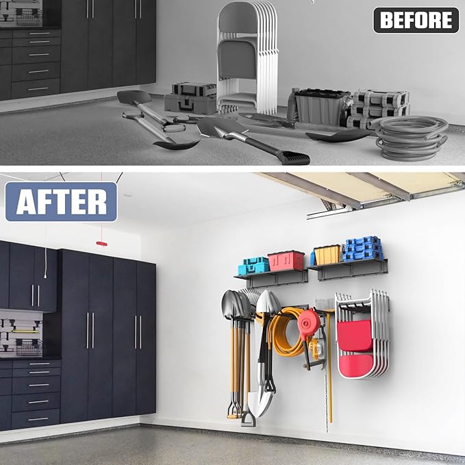 - Maximize Your Garage Space: Keep garden tools, ladders, folding chairs, and more off the floor and neatly stored on the wall. This tool hanger helps free up floor space while keeping everything organized and within reach