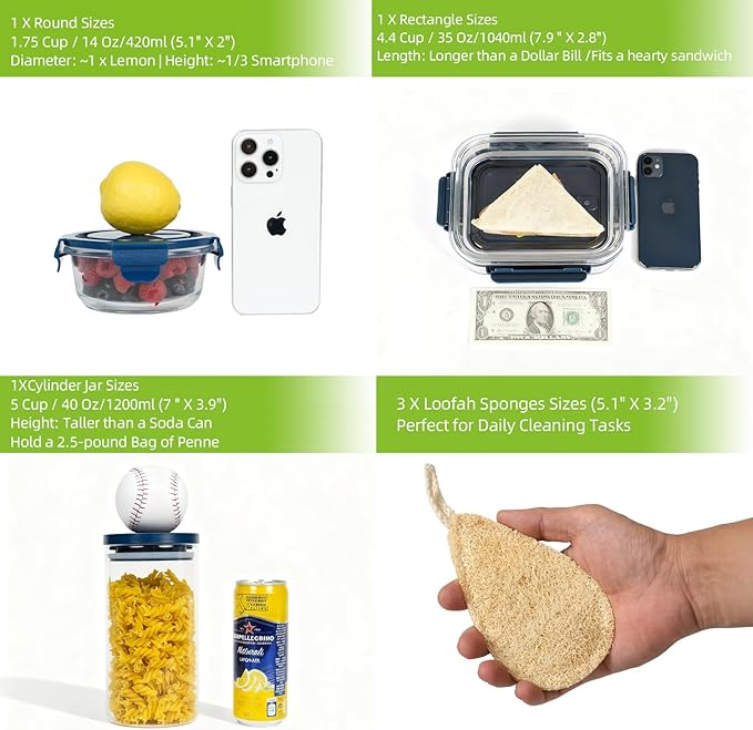 - 【THE ULTIMATE KITCHEN ESSENTIALS SET 】 - 3-piece meal prep containers reusable set includes 1.75 Cup circular container (dips, dressings, and snacks), 4.4 Cup rectangular container ( meal-prepped lunches and leftovers), and 5 Cup wide-mouth cylindrical container ( pasta, cereal, and bulk snacks). The bohemian cotton pot holders stand ready to protect countertops as trivets or double as stylish table decor. 100% natural loofah sponge provides a non-scratch, eco-friendly clean for all your dishes.
