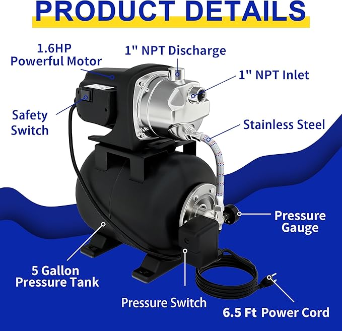 - Easy Operation - This shallow well jet pump is easy to operate, starts at 20psi and shuts off at 40psi, and comes with a pressure switch and external pressure gauge for real-time visibility into your tank. Compact 5 gallon pressure tank prolongs its service life. Waterproof On/Off switch ensures the safe operation