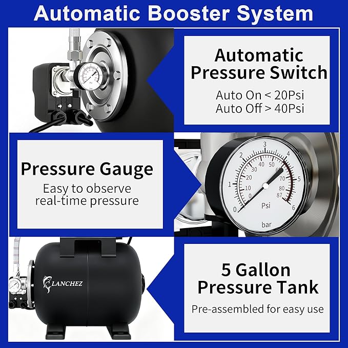 LANCHEZ 1.6HP Shallow Well Pump with Pressure Tank, 115V 1340GPH Automatic Irrigation Water Booster Jet Pump, Stainless Steel Water Transfer Pump for Home Garden Lawn Sprinkler Irrigation, Matte