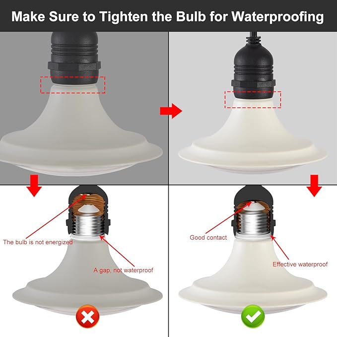 - 【Waterproof and Durable】Crafted from high-quality waterproof materials, UL-certified plugs, and power cords for safety. With IP65 waterproof rating, these lights are perfect for outdoor use. Three small holes in the bulb's center release moisture, preventing internal damage.