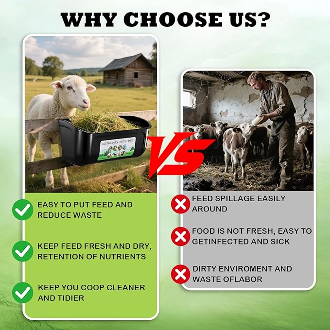 - No Waste, No Spill, No Mess: Hanging fence feed trough unlike traditional ground feeding methods, hanging off the ground is minimize feed spillage, promoting healthy eating habits and reducing waste. Keep feed fresh and dry for your livestock's optimal nutrition. Say goodbye to a messy farm and chicken coop