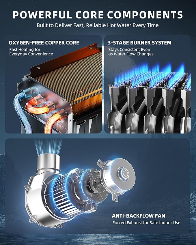 - Efficient & Durable: Featuring oxygen-free copper heat exchangers and innovative segmented combustion technology, this tankless water heater achieves exceptional 85%+ thermal efficiency. Designed for maximum performance, it delivers 30% greater energy savings than conventional tank water heater models.