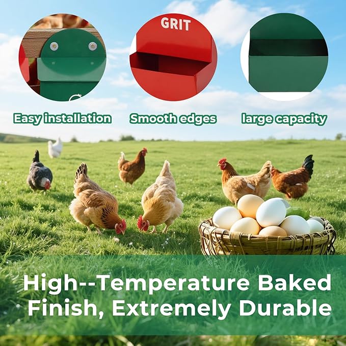 - DUAL COMPARTMENTS – PREVENT FEED MIXING: Keep chicken grit and oyster shell separate for optimal digestion and stronger eggshells. The clear color-coded design (red for grit, green for oyster) makes feeding accurate and effortless for backyard poultry owners.