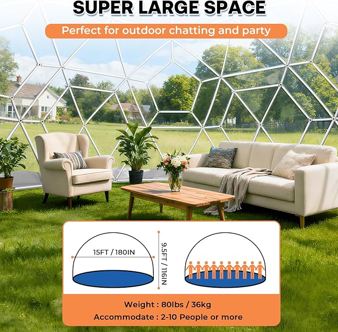 - 🥳【Adequate capacity】The garden dome tent offers three size options to cater to different group sizes: 9.5ft (2-4 people), 12ft (4-8 people), and 15ft (8-12 people), each available with green or white borders. All these big dome houses, featuring thick TPU tent covers, provide spacious interior spaces, allowing you to create a warm and comfortable place for your family or friends.