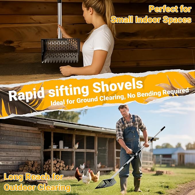 - 10" Wide Sifting Head – Clean Faster, Save More Bedding: The 10-inch wide metal shovel head features precision-cut sifting holes designed to effectively separate chicken droppings from clean sand, shavings, or bedding. This reduces waste and extends the life of your coop material, helping you maintain a cleaner, drier environment with every use