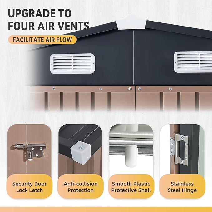 - Convenient Access & Enhanced Ventilation: Experience unparalleled convenience with the double front doors of this shed. They allow for easy storage of large items like bicycles and lawn mowers without any hassle. The integrated top ventilation vents play a crucial role in regulating airflow inside the shed, effectively preventing condensation. For added security, stainless steel latch locks and reinforced hinges are included, protecting your belongings from theft and animal intrusions.