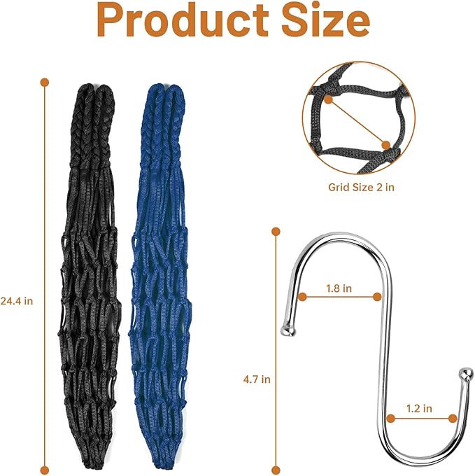 - Product List: Inludes 2 hanging chicken vegetable string bags (1 black and 1 blue, each bag measures 24'') and 2 hooks for hanging