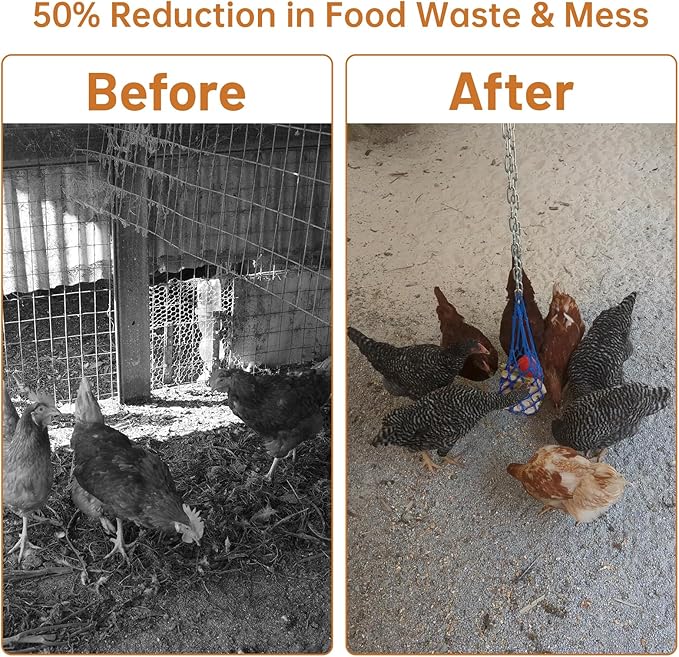 - Versatile Feeder: The hanging chicken feeder can hold various fruits or veggies to stimulate foraging behavior and also serve as chicken coop toy