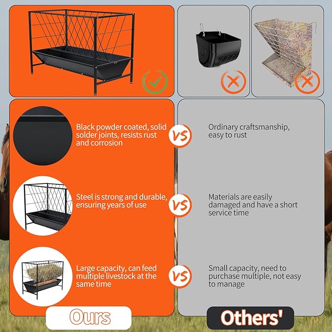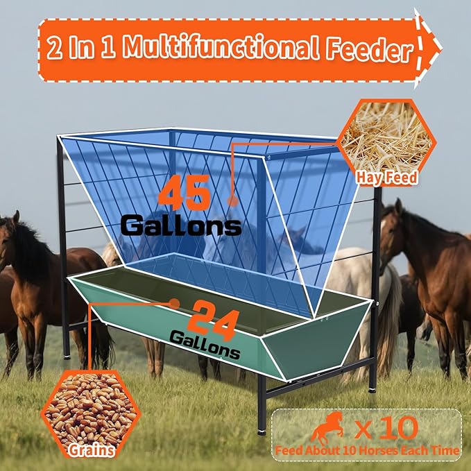 - 【2-In-1 Livestock Feeder】The livestock feeder combines hay trough and feeding pan that enriches the feed for sheep, calf, cow and horse. The top grass rack provides 45 gallon of space for forage, allowing your livestock to graze freely; the feeder boasts a 24 gallon feed pan at the bottom, ensuring your animals have constant access to nutrition. It’s the perfect hay feeder for goats, ensuring that your animals eat in a sanitary and convenient way.