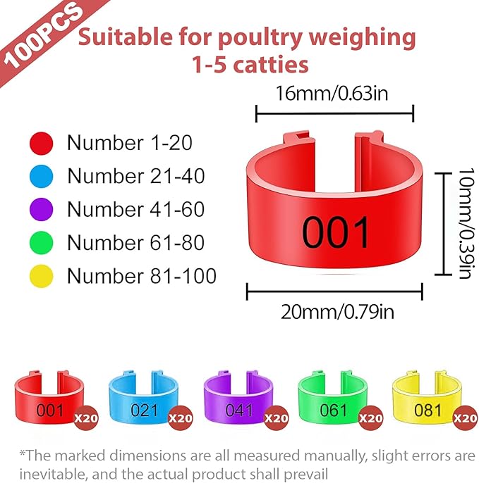 - 【16 mm Professional Pack】100 bands per pack in multicolor assortment—ample for large‑scale flocks or precise small‑farm tracking. Compatible with chickens, ducks and other poultry