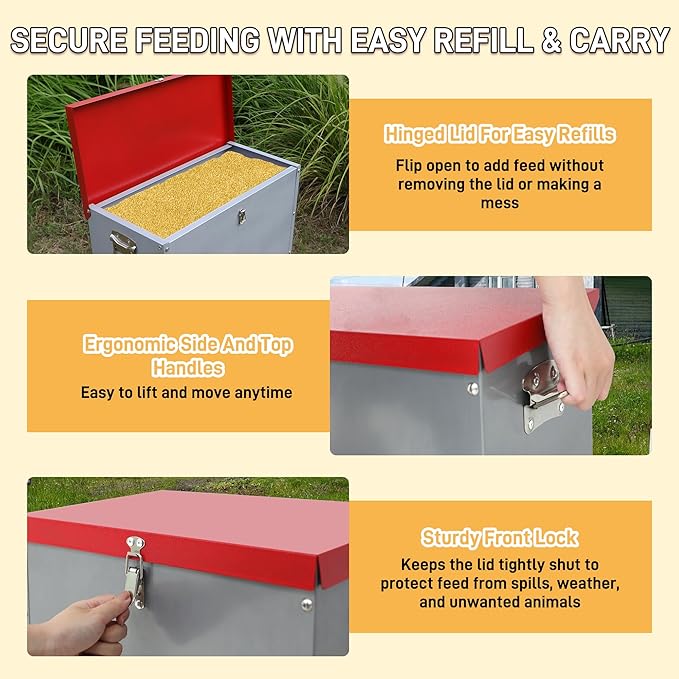 - 【Convenient to Use and Maintain】The wide opening design makes refilling quick and mess-free, while the waterproof, smooth metal surface allows for easy cleaning by rinsing or wiping. Smoothed edges minimize accidental scratches, protecting both you and your flock. Side handles provide effortless lifting and relocation, giving you flexibility in placement and daily use—making poultry care safer, easier, and more efficient.