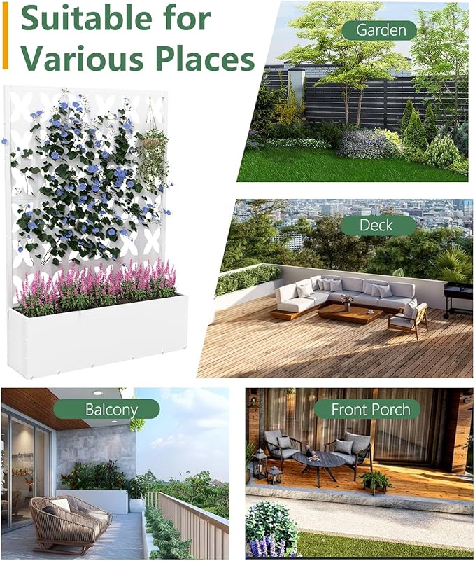 - Multi-Functional Raised Garden Bed with Trellis: This versatile metal planter box serves triple duty as: an elevated garden bed for vegetables and flowers,a sturdy trellis for climbing plants, and a decorative privacy screen - perfect for backyards, patios, and balconies. Its space-saving design maximizes your growing area while enhancing outdoor aesthetics.