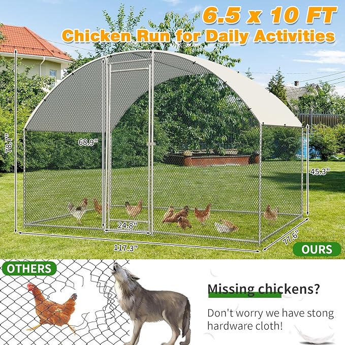 VINGLI Chicken Coop, Large Metal Poultry Cage for Chicken Run, Walk-in Chicken Pen with Waterproof & Anti-UV Cover Outdoor (Silver-Dome Roof, 6.5 * 9.8 * 6.5 ft)