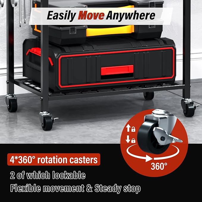 - 【Flexible and Stable】The rack has lockable 360° swivel casters, allowing it to be moved flexibly between garages, workshops, and yards, and can be locked anywhere you want. This combination of flexibility and stability transcends the limitations of fixed storage.