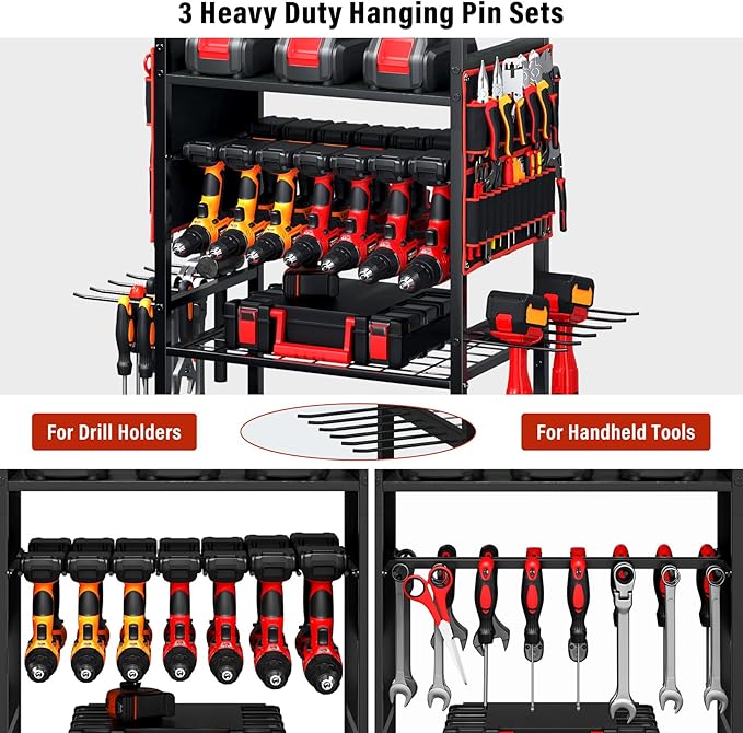 - 【Large Storage Capacity】Features a high-quality wooden top shelf and two layers of iron mesh shelves below, it can handle up to 450 pounds, making it ideal for storing heavy tool boxes and tools. Plus, with three dedicated drill racks that hold up to 24 drills at once, you’ll have everything locked, maximizing storage space.