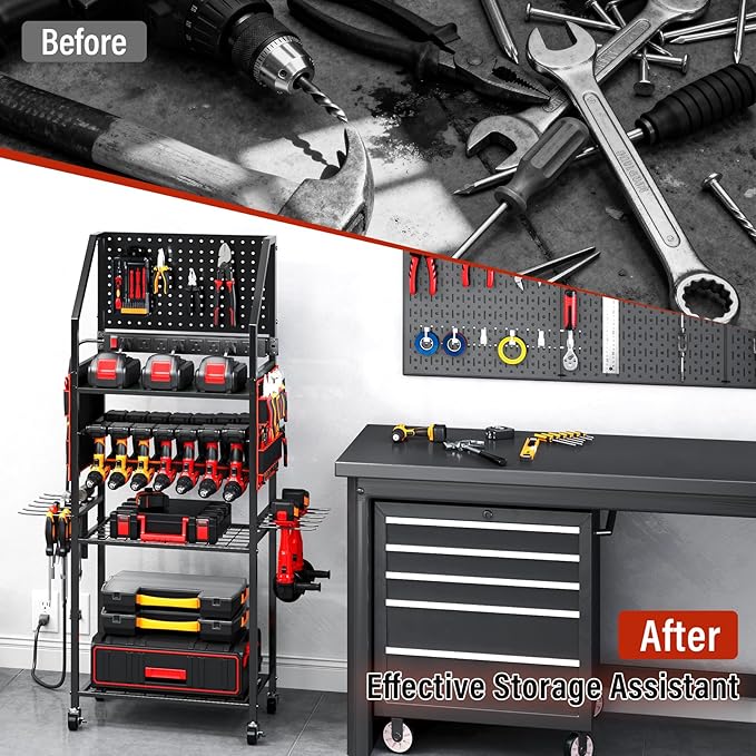 - 【All-in-One Design Cart】TC-HOMENY power tool organizer cart rolls storage, charging, and mobility into one slick setup. Its heightened design measures 49.5" x 27.5" x 11.6". With five functional compartments: a pegboard with hooks, 2 canvas side pockets for small tools, 3 sets of drill holders, 3 roomy shelves, and a power strip packing 8 AC outlets. It's perfect for storing tools and boxes of various sizes, allowing for organized storage and easy access.