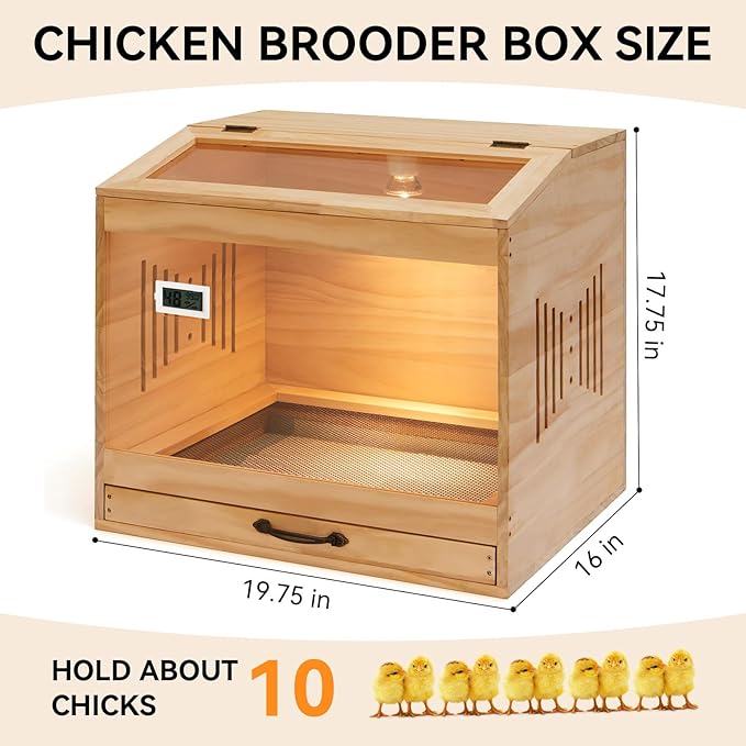 - [Durable Wooden Build with Clear Acrylic Panels for Safe Viewing] Made from eco-friendly solid wood, this baby chick starter kit is strong, long-lasting, and provides excellent insulation to maintain a stable brooding temperature. The acrylic side panels are impact- and scratch-resistant, offering crystal-clear visibility so you can easily monitor your animals' growth and health