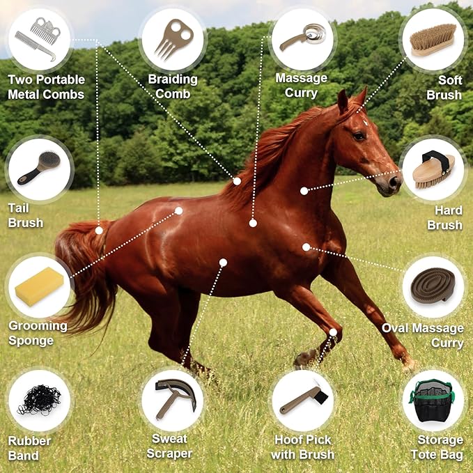 - 14-Piece Horse Grooming Kit: This horse grooming kit includes 1x Mane and Tail Brush, 1x Soft Horse Brush, 1x Hard Horse Brush, 1x Oval Massage Curry, 1x Curry Comb, 1x Hoof Pick with Brush, 1x Sweat Scraper, 1x Grooming Sponge, 2x Portable Metal Comb, 1x Horse Braiding Comb, 1x Rubber Band, 1x Gloves, 1x Storage Tote Bag