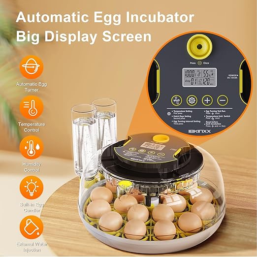 - 【Automatic Egg Turner for Better Hatch Rates】 The chicken egg incubator features an automatic egg turning system, mimicking natural conditions (Optional automatic turning frequency: once every 60, 120, or 180 minutes). This improves hatch success by turning eggs at the right intervals and stopping three days before hatching to prevent over-turning.