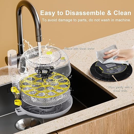 - 【360° Transparent View for Monitoring & Easy to clean】 This chicken incubator's clear transparent design provides a 360° view, allowing you to easily monitor the hatching process without disturbing the eggs. The incubator structure is designed to disassemble and clean easily, the ventilation system has an upper cover that can be easily opened, and the lower tray can be cleaned with water, which can be reused and protect the incubator.