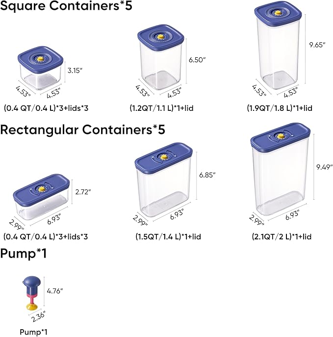 - What's Included: 0.4QT square containers&lids*3 , 1.2 QT square containers&lids*1, 1.9 QT square containers&lids*1, 0.4QT rectangular containers&lids*3, 1.5 QT rectangular containers&lids*1, 2.1 QT rectangular containers&lids*1; Vacuum Pump*1